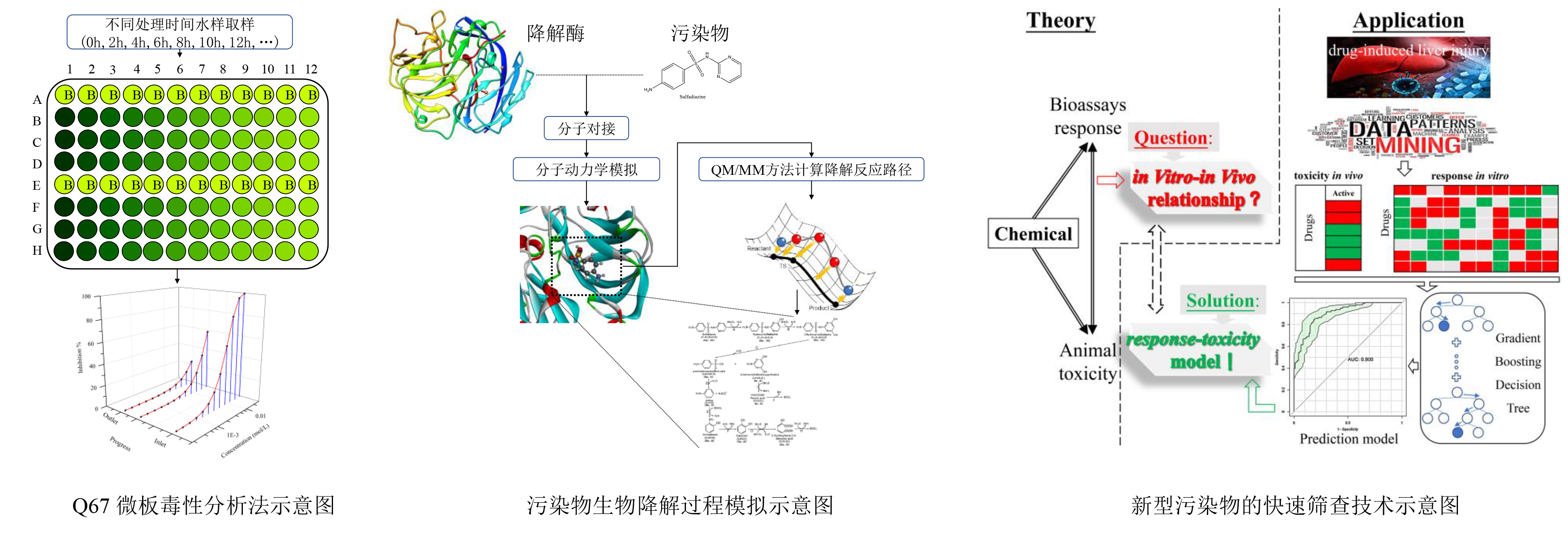 (1)污染物高通量毒理学筛查与风险评估。采用微板毒性分析法等高通量测试手段,评估污染物的急慢性毒性与特定生物学效应。深度融合计算毒理学与多组学分析,揭示毒性作用机制。通过多元混合物设计方法,模拟与评估复合暴露环境下的联合毒性风险。